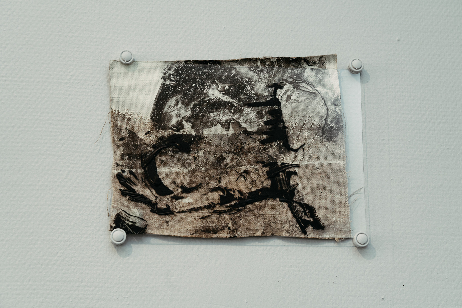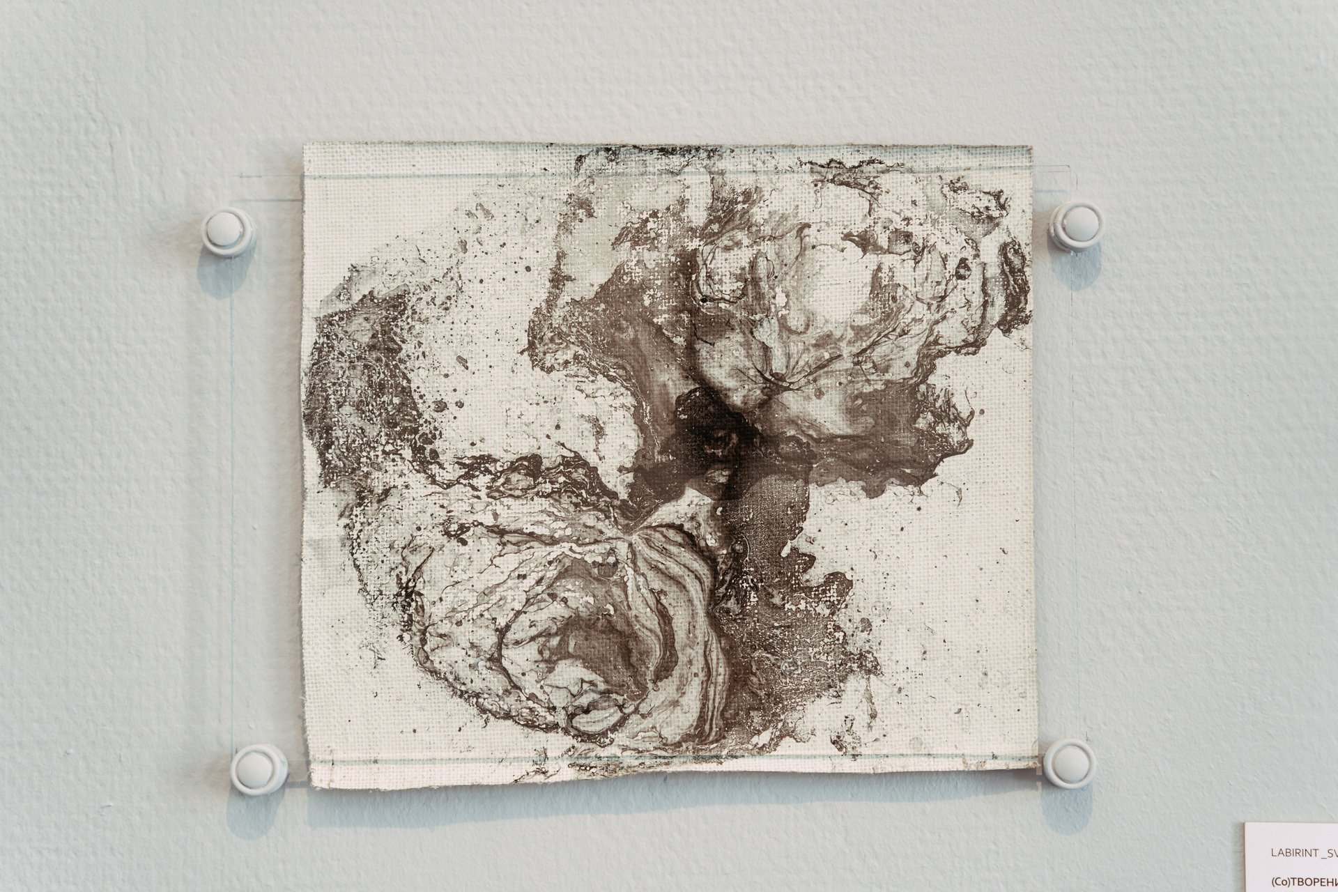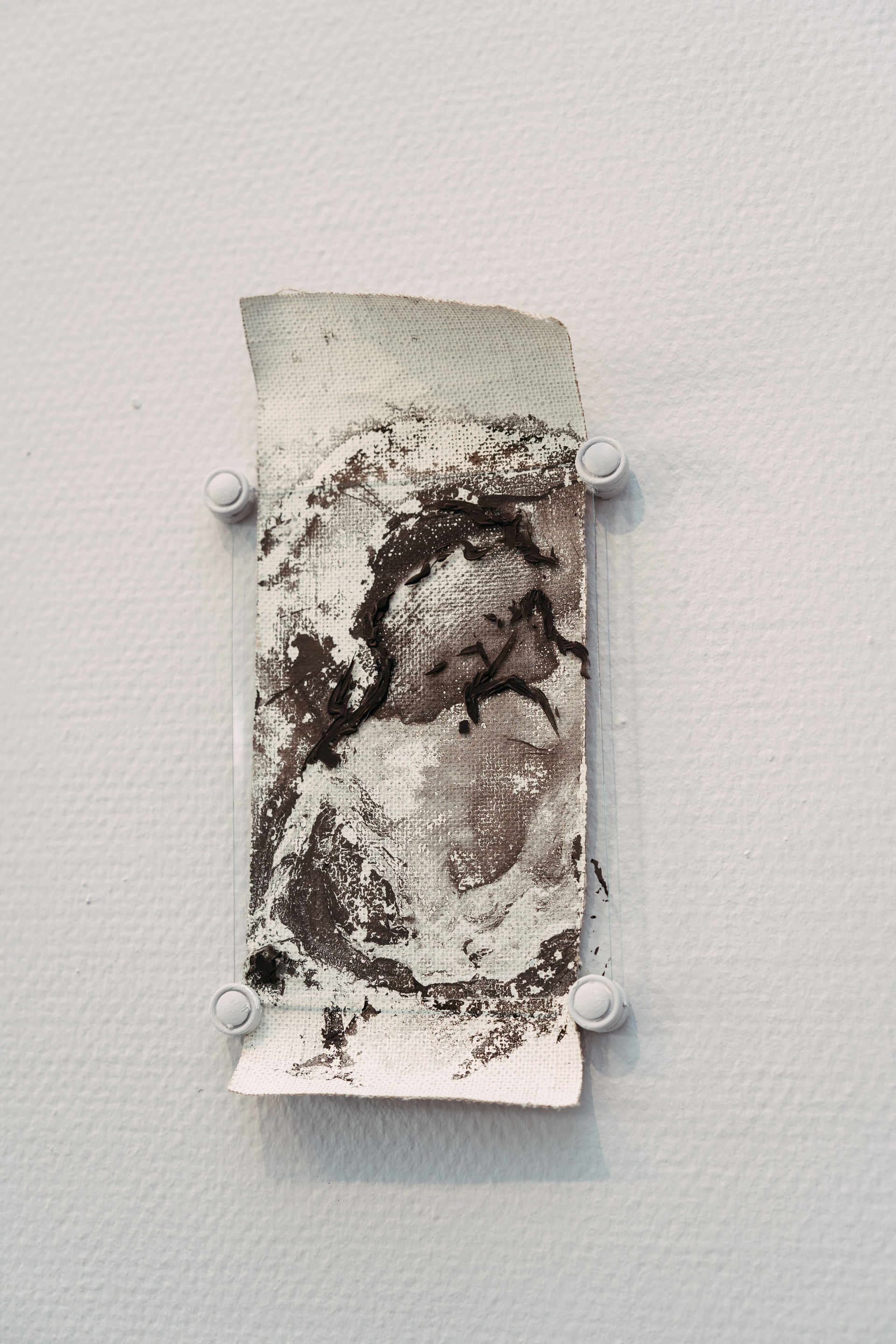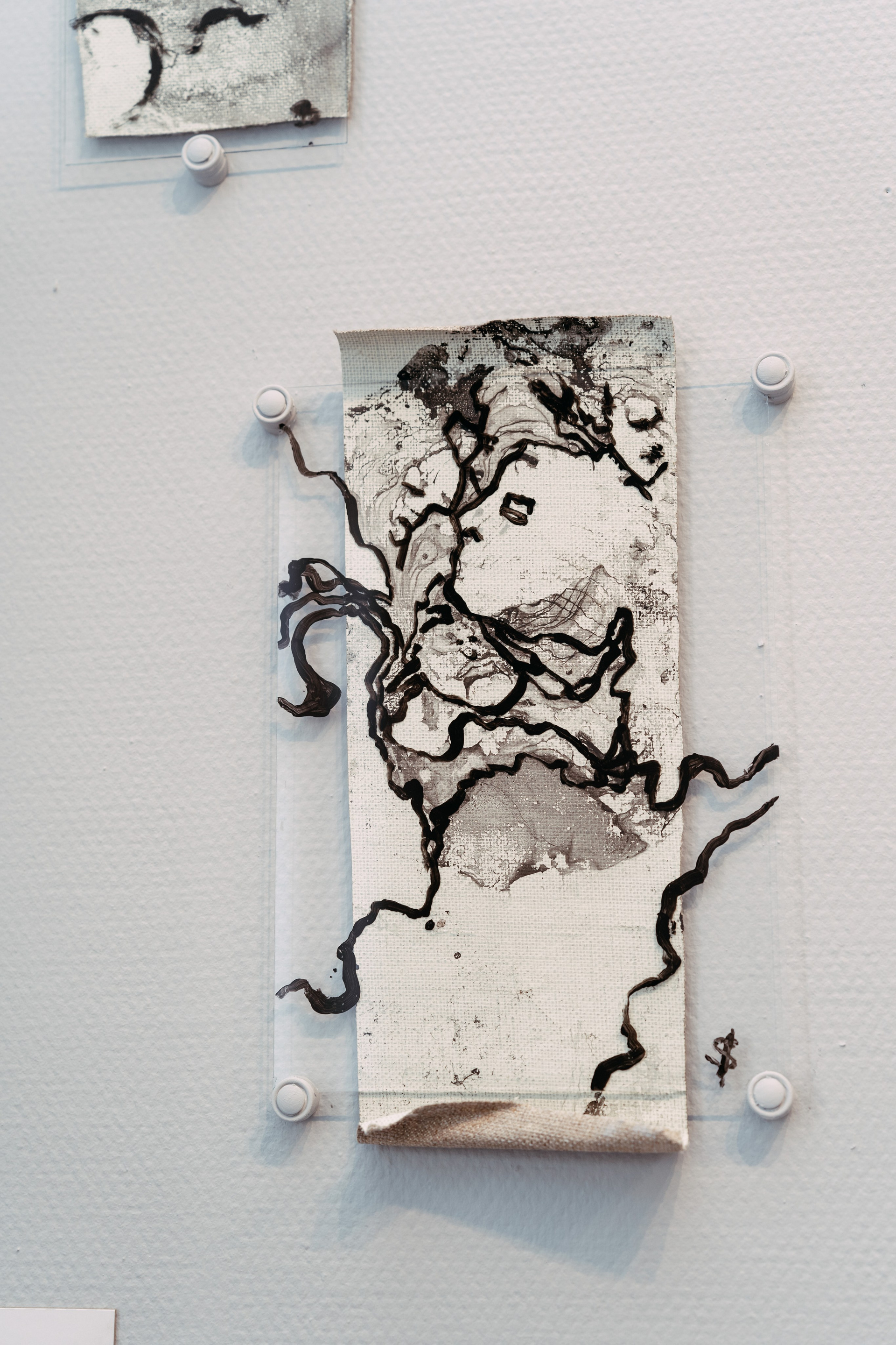 The process of Co-Creation is embodied in the materials and techniques chosen for this series: aged canvases, their grounds flaking and crumbling like the artist’s own strengths and vulnerabilities, now absorb abstract stains from the surface of water — revealing hidden forms and meanings as if drawn from the unseen. The paint does not impose; it responds. The canvas does not resist; it remembers. And in this quiet surrender, something greater than the artist emerges — not as control, but as revelation.